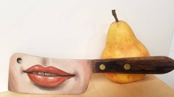 Gambar di atas adalah gambar pisau dengan buah. Namun pisaunya ada gamabr mulut yang sedang menganga.