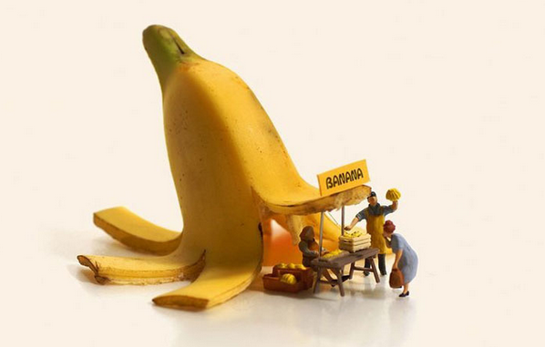 Gamabr di atas adalah gambar seolah-olah sedang berjualan di bawah kulit pisang. Pisangnya di bentuk seolah-olah rumah atapnya.