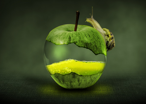 Apel hijau dengan siput. Gambar di atas adalah gambar apel dengan siput di atasnya. Namun ada hal yang menarik yaitu bagian tengah transparan.