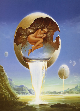 Telur terbang dengan air terjun. Gambar di atas adalah gambar air terjun namun di atas cangkang telur. Yang menarik adalah ada seorang wanita di dalam cangkang telur tersebut sedang tidur.
