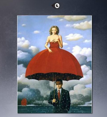 Berpayung gaun wanita. Laki-laki yang tampak memayungi dirinya karena kehujanan. Namun paying yang di gunakan adalah seorang wanita memakai gaun merah.