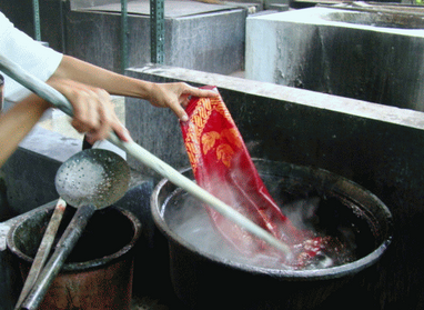 6) Menghilangkan lilin atau nglorot, siapkan air mendidih celupkan kain. Merebus kain bertukuan untuk menghilanhkan lapisan lilin, sehingga gambar batik akan terlihat jelas.