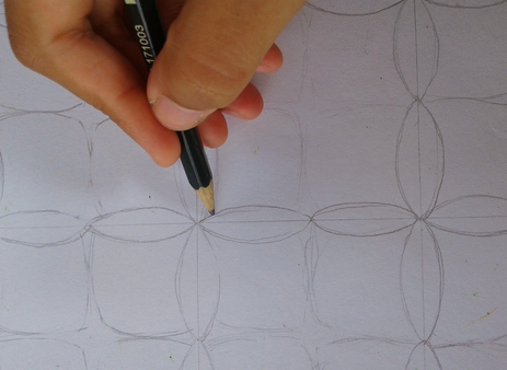 2) Setelah membuat pola batik, selanjutnya adalah tebalkan motif tersebut dengan menggunakan lilin yang sudah dicairkan. Tahapan ini, kamu akan menggunakan canting, istilahnya dikandangi atau dicantangi.
