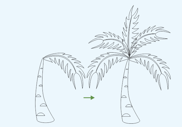 - Di bagian ujung atas garis, buatlah kerangka ranting daun (pelepah) kelapa, dengan membentuk sketsa melengkung dari semua sisinya.