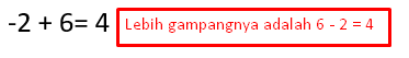 Pada gambar di atas kita harus ke kiri terlebih dahulu -2 langkah. Kemudian ke kanan karna 6 adalah positif. Tetapi mulainya dari -2 sehingga berenti di anggka 4.