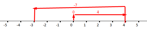 Pada gambar di atas kita harus ke kanan karna 4 positif. Kemudian ke kiri 7 langkah karena negatif. Tetapi di mulai dari 4 maka berhenti di angka 3.