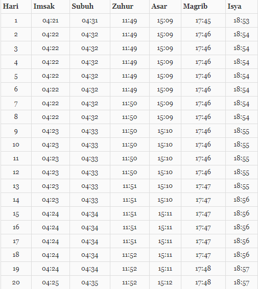 Nah jadwal imsakiyah ini diambil pada Koordinat: (-5.40, 105.27). Zona Waktu: Asia/Jakarta. Arah Kiblat: 295° dari Utara. Hampir sama lah sama singapure malaysia dan brunai darusalam. Berikut jadwalnya gua ambil dari www.pikiran.rakyat.com terjamin akurat sob.