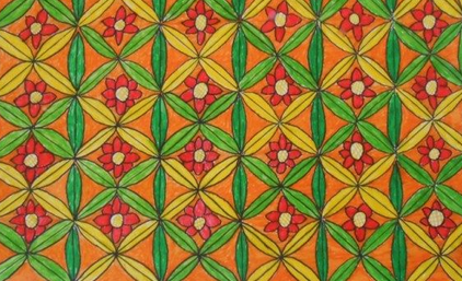 Daun paku khas bergerigi di setiap ujungnya. Motif ini di ulang-ulang dan di berikan sentuhan warna. Kalian bisa membuat seketsanya hanya satu kemudian di jiplak terus menerus.