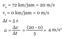 Saat mendekati lampu lalu lintas, mobil yang awalnya bergerak dengan kecepatan 72 km/jam (20 m/s) diperlambat hingga 0 km/jam dalam selang waktu 5 sekon dengan proses perubahan seperti dalam Tabel berikut: