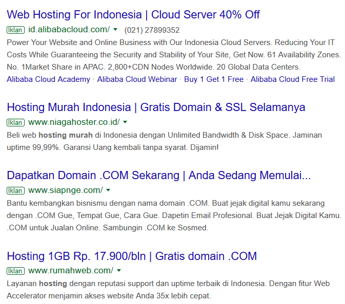 Pengertian iklan PPC adalah singkatan dari kata Pay per click yaitu bayar per klik. PPC merupakan salah satu metode beriklan di internet yang populer saat ini. Pengiklan atau advertiser hanya akan membayar jika ada yang mengklik iklannya. PPC adalah suatu [erogram pemasangan iklan yang di sediakan oleh seuatu vendor atau penyedia jasa layanan. Kalian bisa ketik saja di google “hosting murah” maka akan muncul banyak sekali hosting-hosting yang menyediakan dari harga yang murah sampai lumayan