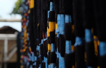 Setelah pemintalan benang putih tahap selanjutnya adalah pembuatan motif kain. Pembuatan motif ini dilakukan dengan mengikat benang yang sudah di pintal dengan tali rapia dengan sangat kuat. Tali menalinya pun bukan sembarangan, ada pola yang di buat hingga membentuk motif di bantu dengan plastik transparan.
